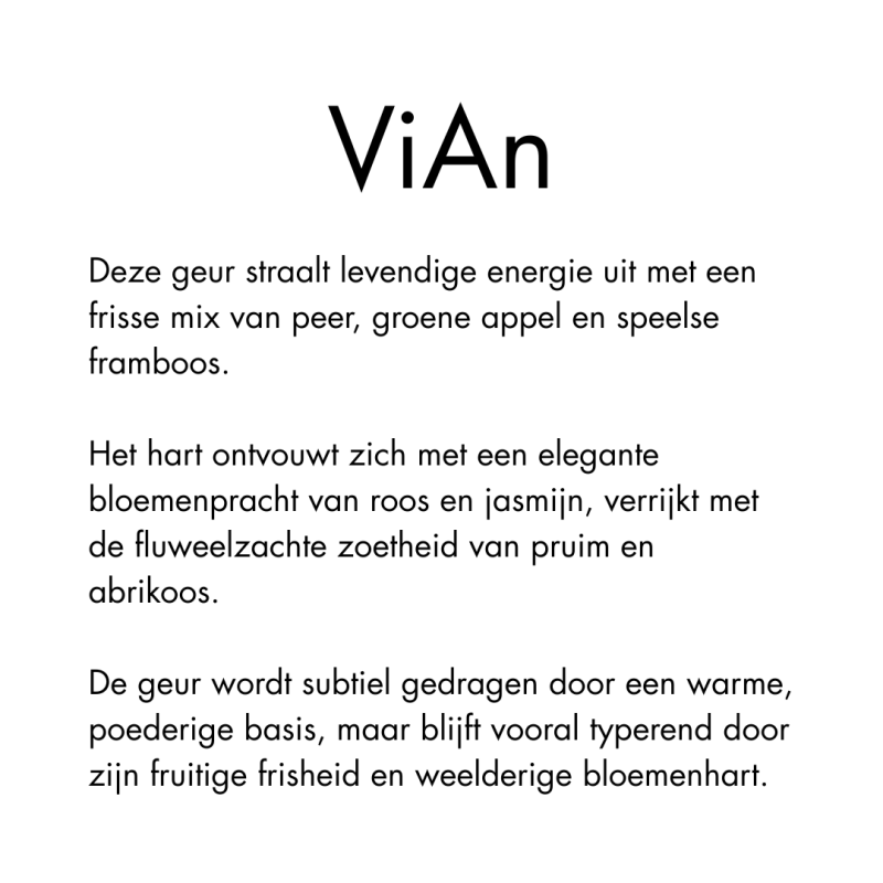 Ervaar de weelderige geur van ELGI-NIUS ViAn. Deze unieke compositie combineert frisse citrusnoten met een hart van rijke bloemen en een warme, sensuele basis. Perfect voor een verfijnde en verleidelijke geurervaring die de hele dag meegaat.